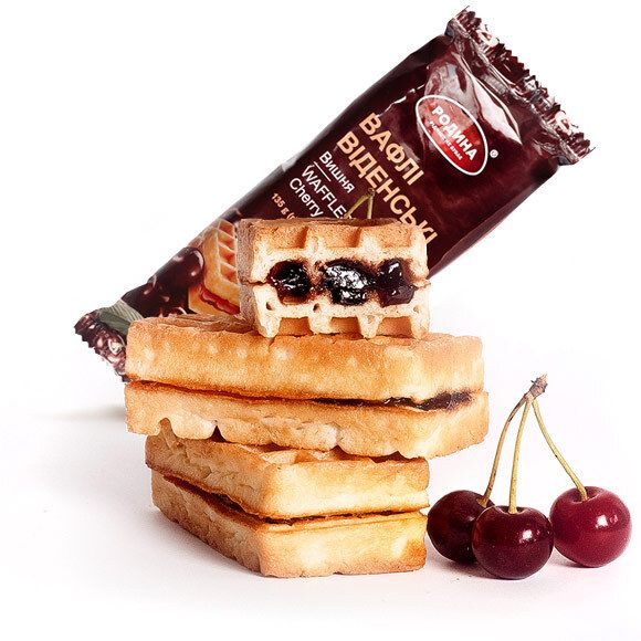 Смачні бісквітні вафлі Віденські з вишневою начинкою упаковані для всієї родини. Насолоджуйтесь ідеальним десертом разом.